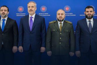 وزير الخارجية أسعد الشيباني، يرافقه مدير جهاز المخابرات العامة حسين السلامة ووزير الدفاع مرهف أبو قصرة، يلتقون وزير الخارجية التركي هاكان فيدان في أنقرة - رويترز